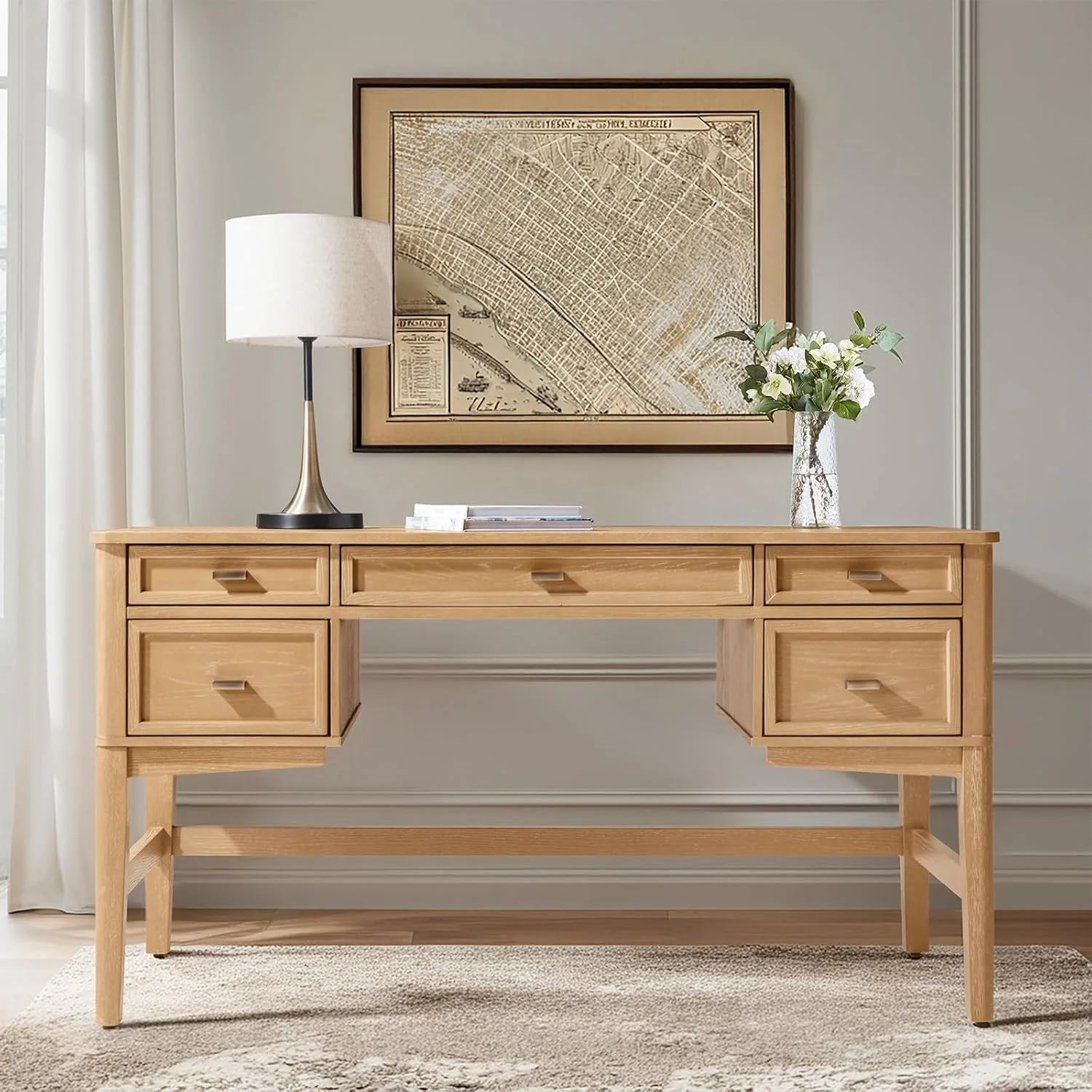 This mid-century modern desk combines timeless design with thoughtful functionality. Solid wood legs provide strong construction, while five drawers — including a hidden compartment — offer smart storage to help keep your workspace organized. The warm oak finish and clean lines make it a statement piece that balances style and productivity in today’s home office.