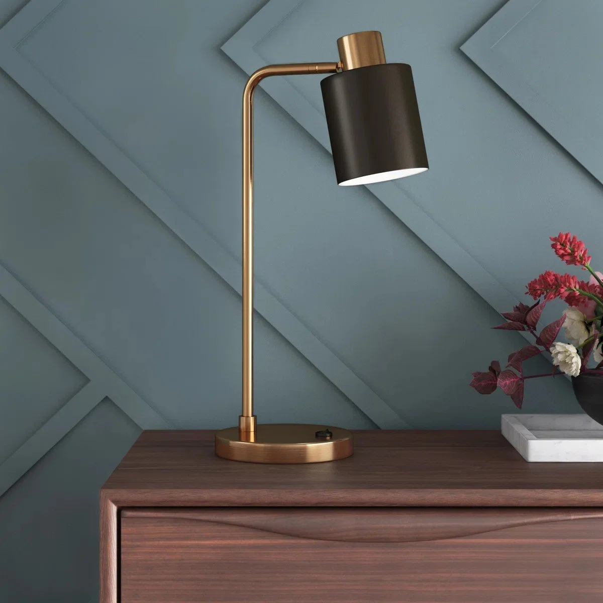 A modern classic for the curated workspace. The Khambrel 21" Desk Lamp blends a warm brushed-brass frame with a sleek matte-black shade, creating a crisp, architectural look perfect for elevated home offices and styled desk moments.
